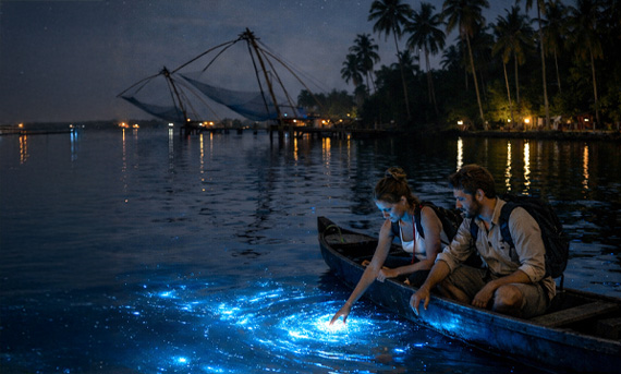 • Experience the magical bioluminescence, locally called Kavarum, by the coasts of Kumbalangi and Chellanam, near Kochi. This magical neon-blue glitter by the coast is one of the most magical night travel experiences in Kerala in April and May.
